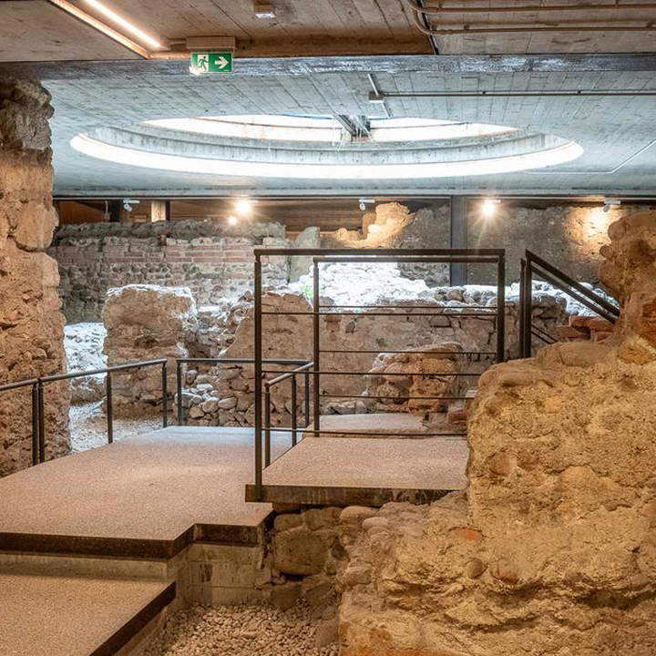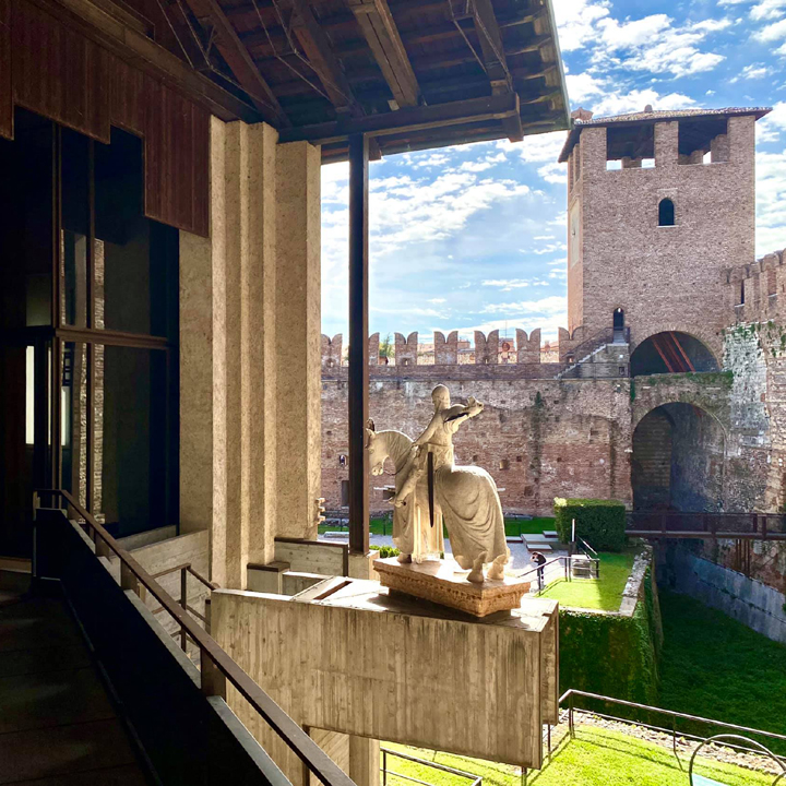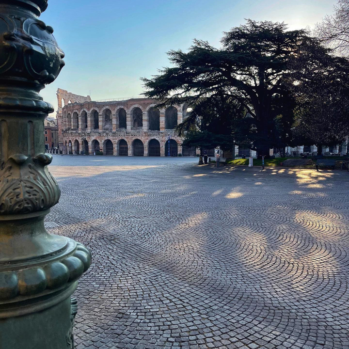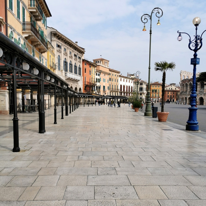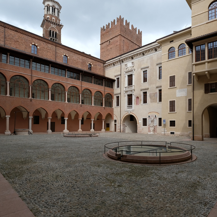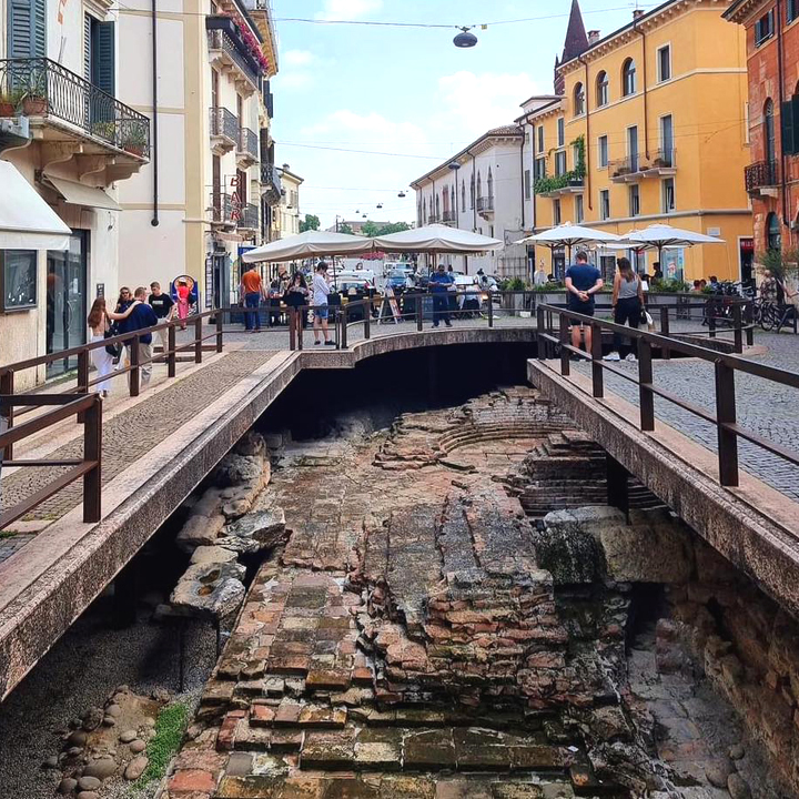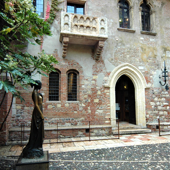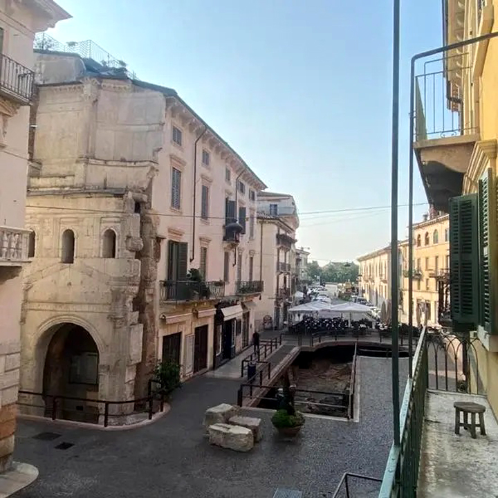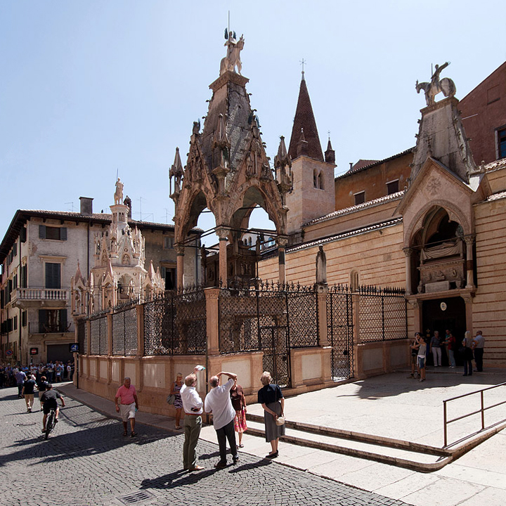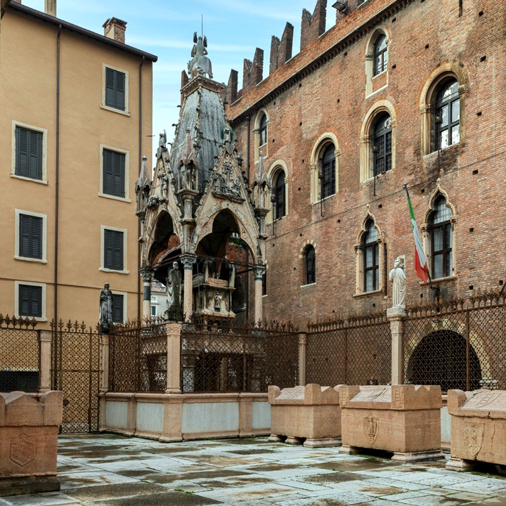 Scavi archeologici con pavimentazioni romane separano il PALAZZO DEL CAPITANIO da quello della Ragione. Accanto ad esso c’è la Chiesa di Santa Maria Antica con il monumentale cimitero delle ARCHE SCALIGERE che conserva i sepolcri dei Signori di Verona e i grandiosi monumenti funebri di Cangrande, Mastino II e Cansignorio della Scala. Di fronte alla Chiesa, nel lato breve della Piazza, si erge maestoso il PALAZZO DI CANGRANDE, formato da un articolato complesso di edifici che si sviluppano su tre lati attorno ad una corte interna. La facciata principale è la più bella e importante, ornata con un portale rinascimentale che rimanda agli archi di trionfo romani. Alla sua sinistra la Loggia di FRA' GIOCONDO che fu realizzata nel XIV secolo per accogliere le riunioni del Consiglio Cittadino. Da un passaggio nel Palazzo del Capitanio si entra nel Cortile del Tribunale, in cui è presente la Porta dei Bombardieri e l'ingresso degli SCAVI SCALIGERI una vasta area archeologica sotterranea che permette di compiere un affascinante viaggio alla scoperta della Verona romana e medievale. Traversando il cortile arriviamo ai giardini di Piazza Indipendenza e da questi a via Cappello, che in epoca romana era il Cardo Massimo. Al civico 23 c’è la CASA DI GIULIETTA in cui secondo la tradizione abitava la famiglia Capuletti. Entrando si accede ad un luminoso cortile su cui si affaccia il famoso balcone, da cui Giulietta parlava con Romeo. Visitabile internamente, offre una ricostruzione delle dimore signorili del XIV secolo. In fondo alla via si trova l’antica PORTA DEI LEONI di cui rimane una metà verticale della parte interna, murata in un palazzo del XIII secolo. Davanti a lei, due metri sotto il livello stradale, sono visibili la base di una delle sue torri difensive e frammenti della pavimentazione. Per tornare al punto di partenza ci dirigiamo verso Piazza Erbe e percorriamo VIA MAZZINI la via dello shopping su cui si affaccia una ininterrotta sequenza di eleganti negozi e boutique