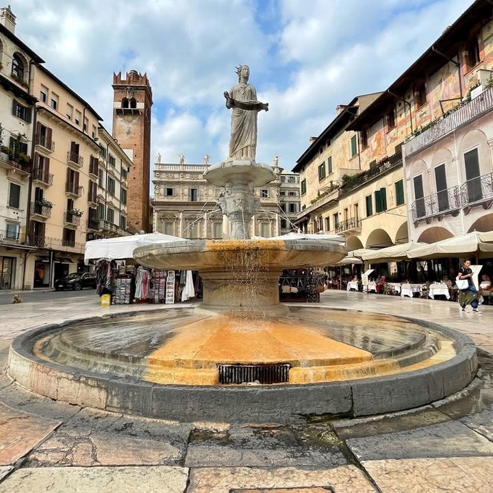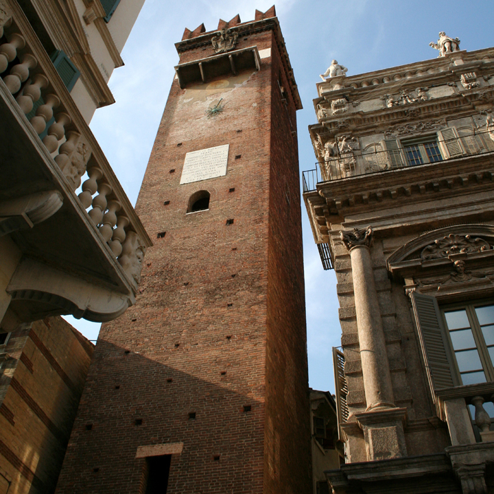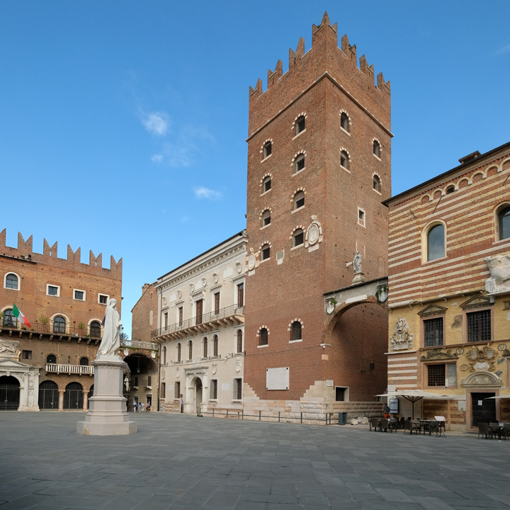 Dal corso si arriva a Piazza Erbe, in cui palazzi, torri, statue ed elementi architettonici sono testimonianze di varie epoche, che sovrapponendosi hanno creato uno degli angoli più belli d'Italia. Per prima si incontra la TORRE DEL GARDELLO sulla sua sommità si trova uno dei più antichi orologi meccanici a campana. Accanto ad essa il barocco Palazzo Maffei con la sua CASA MUSEO, un elegante edificio su tre piani la cui facciata ha una bellezza che rapisce in un lampo fulmineo. In mezzo alla Piazza ci sono la Colonna di San Marco, sovrastata dal Leone simbolo della Serenissima Repubblica; la fontana di Madonna Verona, realizzata nel 1368 utilizzando una statua romana del I secolo; il Capitello, un baldacchino in marmo da cui si facevano i proclami alla cittadinanza e si esponevano le teste dei delinquenti. Sul lato orientale le CASE MAZZANTI ornate con splendidi affreschi rinascimentali e poco oltre il Palazzo della Ragione, edificato nel XII secolo per accogliere le magistrature del Comune. L'imponente torre che lo sovrasta è la TORRE DEI LAMBERTI, eretta nel 1172 seguendo lo stile romanico tipico dell'epoca e varie volte innalzata sino a diventare la più alta della città. Utilizzando un comodo ascensore si può arrivare in cima alla cella campanaria, che offre una vista stupenda sul centro storico e sulle montagne circostanti. Attraversando l'arco della Costa, da cui pende una costola di balena utilizzata nel medioevo come insegna da una bottega, arriviamo nella nobile PIAZZA DEI SIGNORI. Nel centro si erge la statua in marmo di Dante Alighieri, realizzata per celebrare il sommo poeta che per vari anni visse a Verona. Un piccolo volto sulla destra conduce al Cortile del Mercato Vecchio, antica sede del mercato cittadino, in cui si può ammirare la bellissima Scala della Ragione